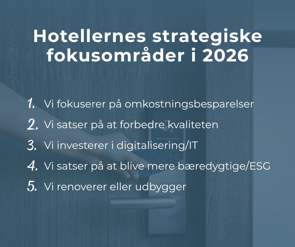 Samlet set viser undersøgelsen, at hotellerne går ind i 2026 med et balanceret strategisk fokus, hvor økonomisk ansvarlighed kombineres med investeringer i kvalitet, teknologi og bæredygtig udvikling.